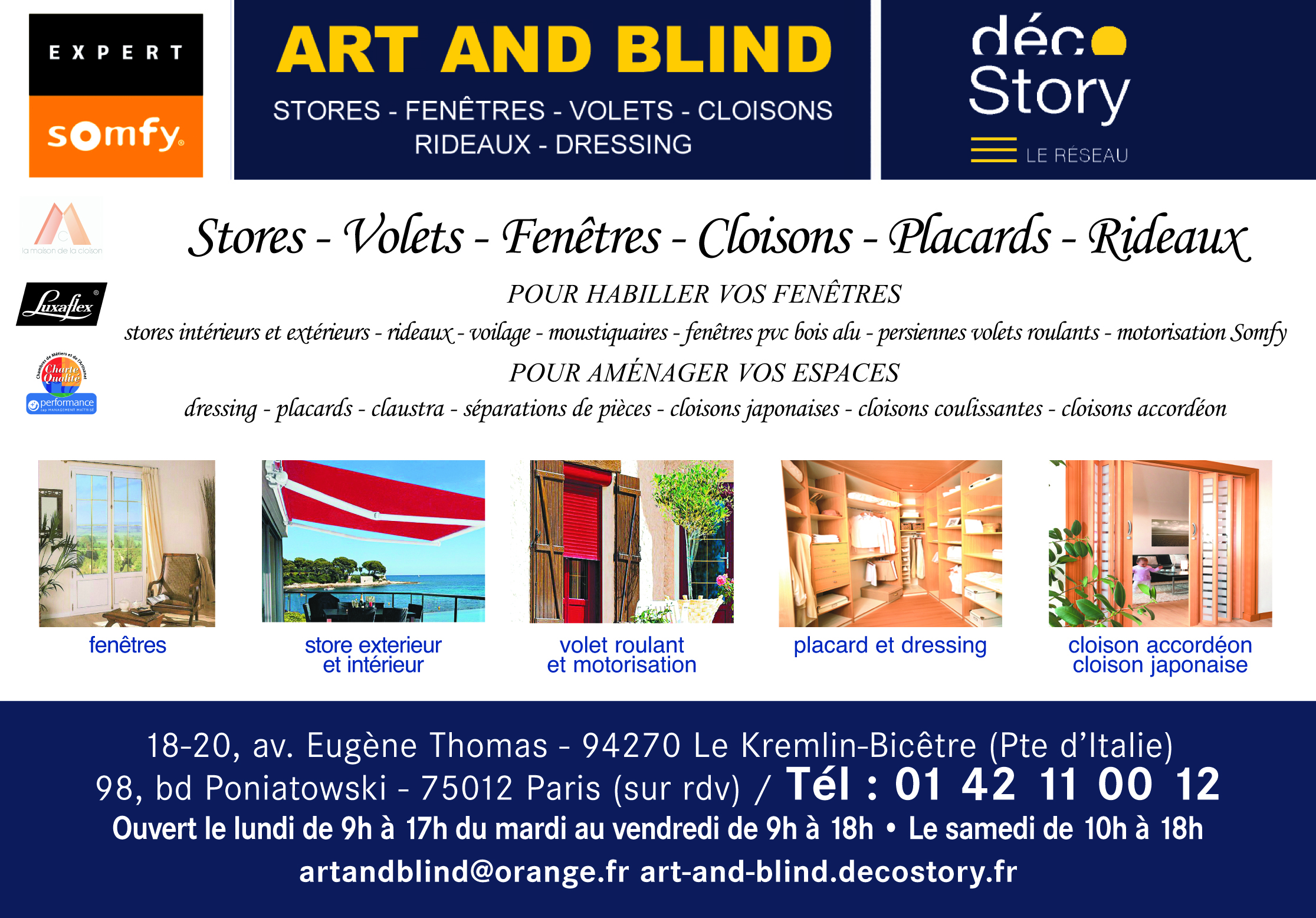 fourniture et pose de stores intérieurs et extérieurs, volets roulants, persiennes, fenetres, motorisation Somfy, rideaux, cloison, placard & dressing - spécialisé dans le sur mesure. Installation par des poseurs maison - Medaille de l'Excellence Artisanale 2023 - Expert Somfy depuis 2004-